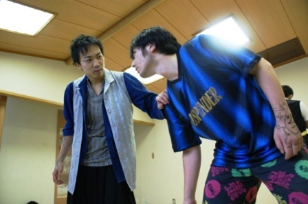「ヴェニスの商人」 8/9,10・8/16,17 稽古場日誌 次回公演 2014年08月21日 0 獣の仕業は地味練が好き立夏です。獣の仕業第九回公演「ヴェニスの商人」[Kingdom Come]の稽古が今月から始まりました。今回の公演も不定期連載で稽古場の様子を写真でお届けします。本番まではまだまだ先?ですが、楽しみにお待ちいただければ幸いです。どの劇団でも初めにやることではないかと思いますが、まずは「獣の仕業」の芝居ってこんな感じでやりますよーと言う簡単なお作法をやりつつ芝居で遊んでみたりなど。小林龍二さんがきえるさんのお腹を押している様子。 「このお前の臓物が芝居の本懐だ!いいな!」「はいいい!」(とは言っていません) 意味深な写真が取れました。皆さんの心がふわふわふわと露になっていく様子を見れるのは稽古場の醍醐味のひとつです。ところで「心の壁」と世間で言うものがありますが、一般的には「壁が取れた状態」がイイコトとされているようですよね。啓発セミナーの広告とかみたことありますし。ただ、それって何が何でも外さなくてもいいんじゃないかな? と思うのが最近の私の気持ちです。外さなければ! となると壁って「悪いモノ」のように聞こえてしまうけれど、果たしてそうなのかなと思っています。必要ならあっていいものだし、それで例えば誰かや自分を不必要に傷つけるなら「カバー」はあったほうが文明として進化しているし、反対に外したければ勿論どんどん外せばいいだけのことで。ただもし舞台表現者に限定した話をするなら、今の自分の状態が壁があるのか/ないのかもしくはその中間の状態なのかを理解して、そしてそれが他者から見ても同じ認識なのか/ズレているのか、の確認は日々必要かもしれません。そうやって自分の癖と言うか「あり方」を見つめて、更にそれを出し入れできたら、嗚呼そんな人は今すぐ一緒に舞台をやりましょう頼み込みに行きます・・・閑話休題。 後半は「ヴェニスの商人」脚本にも取り組みました。役をぐるぐるローテーションしながらひたすら1シーンをマラソンマラソン! 先週の稽古では田澤さんと大学劇研時代の後輩さんS君が来てくれました。田澤さんの芝居が「オセロチューニングVer」で懐かしいと言う気持ちと彼の身体に「オセロ」と言う人間がまだ息づいているのを感じて嬉しくなってみたり。 田澤さんには女性俳優の代役を頼んだのでオカシナことに稽古場日誌は不定期更新です。次回をお楽しみに!獣の仕業公式HP【獣Web】で第八回公演「空騒ぎ」[Much Ado About Nothing!]の本番舞台写真と稽古場写真が更新されました。本番をご覧頂いた方にはあの日のリバイバル、そうでない皆様にも少しでも臨場感が伝わりますように。稽古場などのオフショットも多数公開しています。◆本番舞台写真はこちら ◆稽古場写真&オフショットはこちら