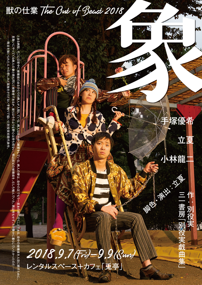 お久しぶりに~10年目から獣の外側へ~ 次回公演 2018年08月24日 0 こんにちは。The Out of Beast 2018「象」。9月7日の初回に向けてモリモリ稽古しております。ということで、ご無沙汰しております。小林です。もう、何年ぶりの投稿になりますでしょうか。昔なんて、芝居に関係なく、例えば電車の中の外国人の会話なぞを書いていたものです。それから早10年。皆さま、これをご覧いただいているお越しくださるお客様にスタッフの皆さま、そして獣に出てくださった皆さま、応援してくださっている皆々様のおかげで、10年目を迎えることができました。獣のしわ、(↑「ざ」抜くとこうなります)経ちました10年、獣の仕業。獣の仕業、は、The Act of Beastと格好よく名乗るものです。「りんごアップル」よろしくです。そんな名前を、今回は変えています。ただの「番外公演」という意味とも違い、「獣の仕業」の、芝居のアイデンティティを剥がすという試みがあります。それは否定ではなく、また新しくリスタートしようじゃないの、というものだと私は理解するものです。たとえば大学でやっていた芝居、獣の仕業を立ち上げてからの第1回、そしてそのあとに構成されてきた獣の仕業、らしさ。アイデンティティ。それを根っこに、また新たな姿になるように、そうです、モリモリしているのです。今回は、主役を手塚優希が、そしてそして自団体では初となる立夏も出演する「象」。これは別役実さんが学生の時に初めて書いた、実質的な処女作で、後年の「病気」や昨今に雑賀玲衣と二人芝居をした「門」ともまた違う作品。当たり前に試行錯誤などしながらつくり上げています。稽古は、先々週にある程度の演出がつけ終わり、先週からは「止め通し」なるものを進めています。これは、一本一気に通すのではなく、じわじわ、じわじわ、一歩ずつ芝居を精緻につくり上げていくことです。昔は、特に粘着質な立夏で、徹底的に突き詰めてやっていたものです。それは、まだアイデンティティが出来ていないような時期だったからでしょう。。今週末には「モリモリ通し」をやります。「モリモリ通し」というのは今つくった言葉ですので、私も何を指しているのかわかりませんが、通しをモリモリやる予定です。・・・モリモリとは?本番まで、残り2週間です。わー言葉に出すと緊張してきましたよ!いつもながら、全員で励んでいきます。あ。宣伝の動画です。youtubeに上がっておりますのでどうぞご覧くださいませ。獣の仕業 こばやし公演特設ページやご予約はこちら獣の仕業 The Out of Beast 2018「象」まもなくです! PR